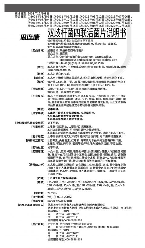 以下為杭州遠大生物制藥有限公司生產(chǎn)的思連康(雙歧桿菌四聯(lián)活菌片)最新產(chǎn)品說明書2022年12月16日修訂版;
