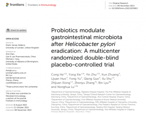 南昌大學第一附屬醫(yī)院呂農(nóng)華教授牽頭,包括西安市中心醫(yī)院、山西醫(yī)科大學第一附屬醫(yī)院、鄭州大學第五附屬醫(yī)院、云南省第一人民醫(yī)院、南京醫(yī)科大學附屬南京醫(yī)院及浙江中醫(yī)藥大學第一附屬醫(yī)院在內(nèi)的全國七家三甲醫(yī)院共同開展了一項為期兩年八個月的多中心、隨機、雙盲、安慰劑對照研究,并在2022年11月Frontiers in Immunology(IF:8.786)發(fā)表了題為”Probiotics modulate gastrintestinal microbiota after Helicobacter pylori eradication:A multicenter randomized double-blind placebo-controlled trial”的研究論文。旨在進一步明確思連康雙歧桿菌四聯(lián)活菌片聯(lián)合14天含鉍劑四聯(lián)療法根除幽門螺桿菌的療效和安全性,以及對胃腸道菌群變化的影響。